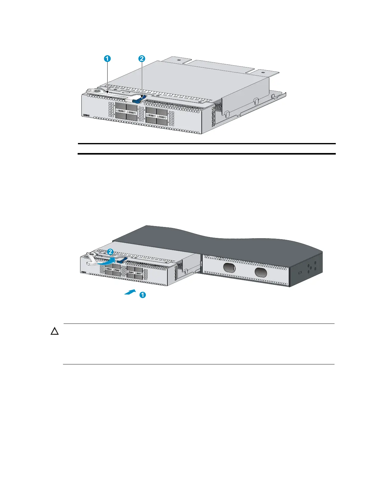 5. Insert the interface module slowly into the slot along the guide rails, as shown by callout 1 in Figure