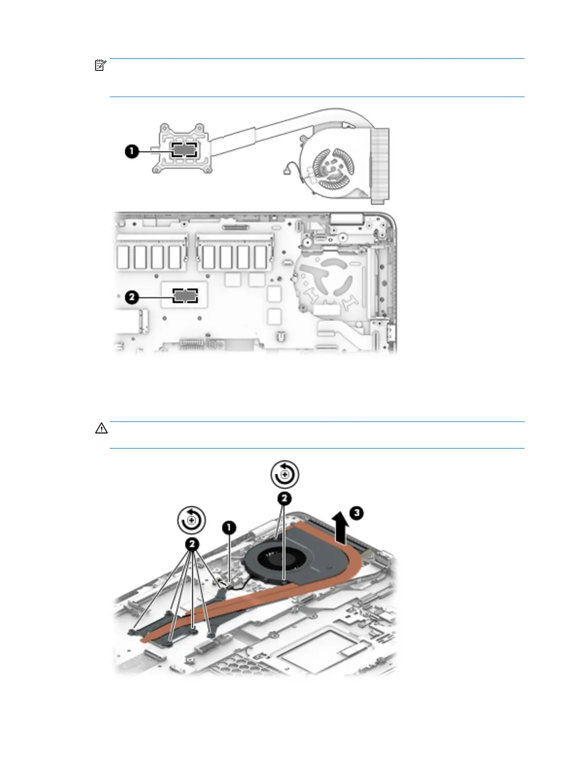 CAUTION: Take extreme care when removing the heat sink and fan assembly. The heatpipes between