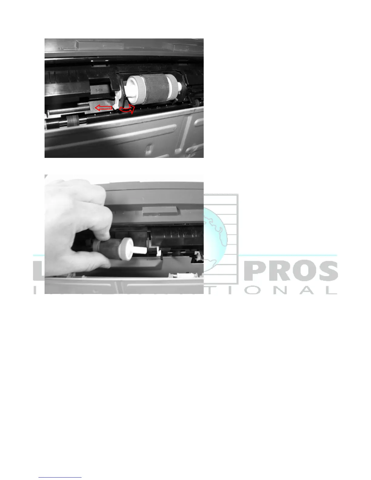 d.) Follow step c.) for right retaining collar but DO NOT REMOVE. Slide the pickup roller to the left to