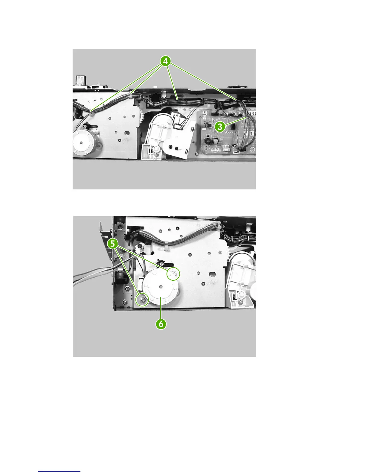 6. Remove two screws (callout 5), and then remove the feeder pickup motor (callout 6).
