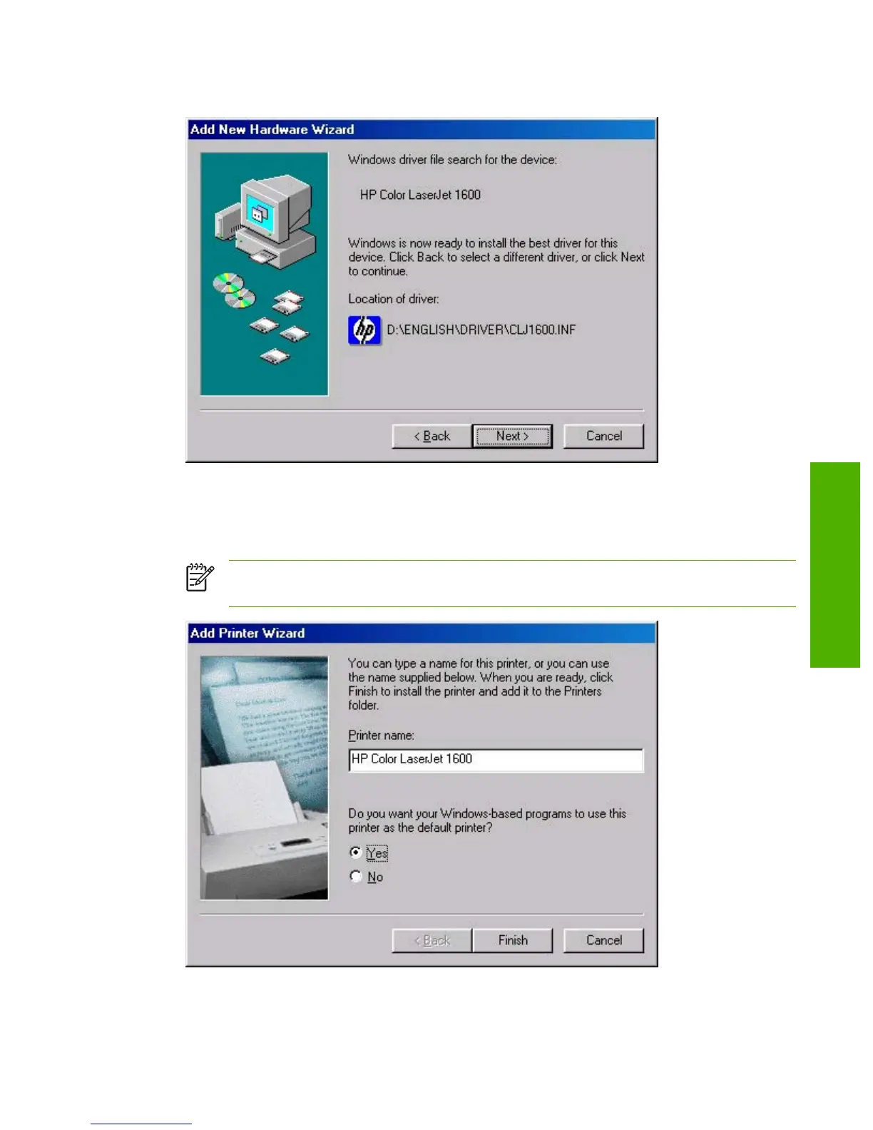 NOTE The Yes and No option buttons do not appear if the HP Color LaserJet 1600 printer
