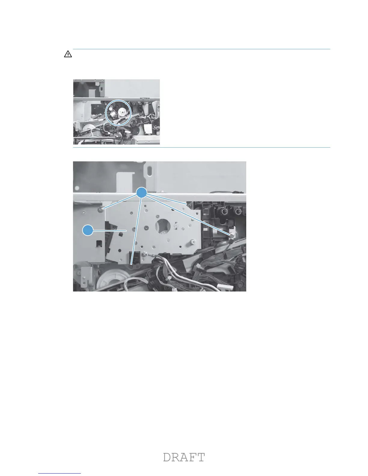 7. Remove four screws (callout 1), and then remove the fuser gear assembly (callout 2).