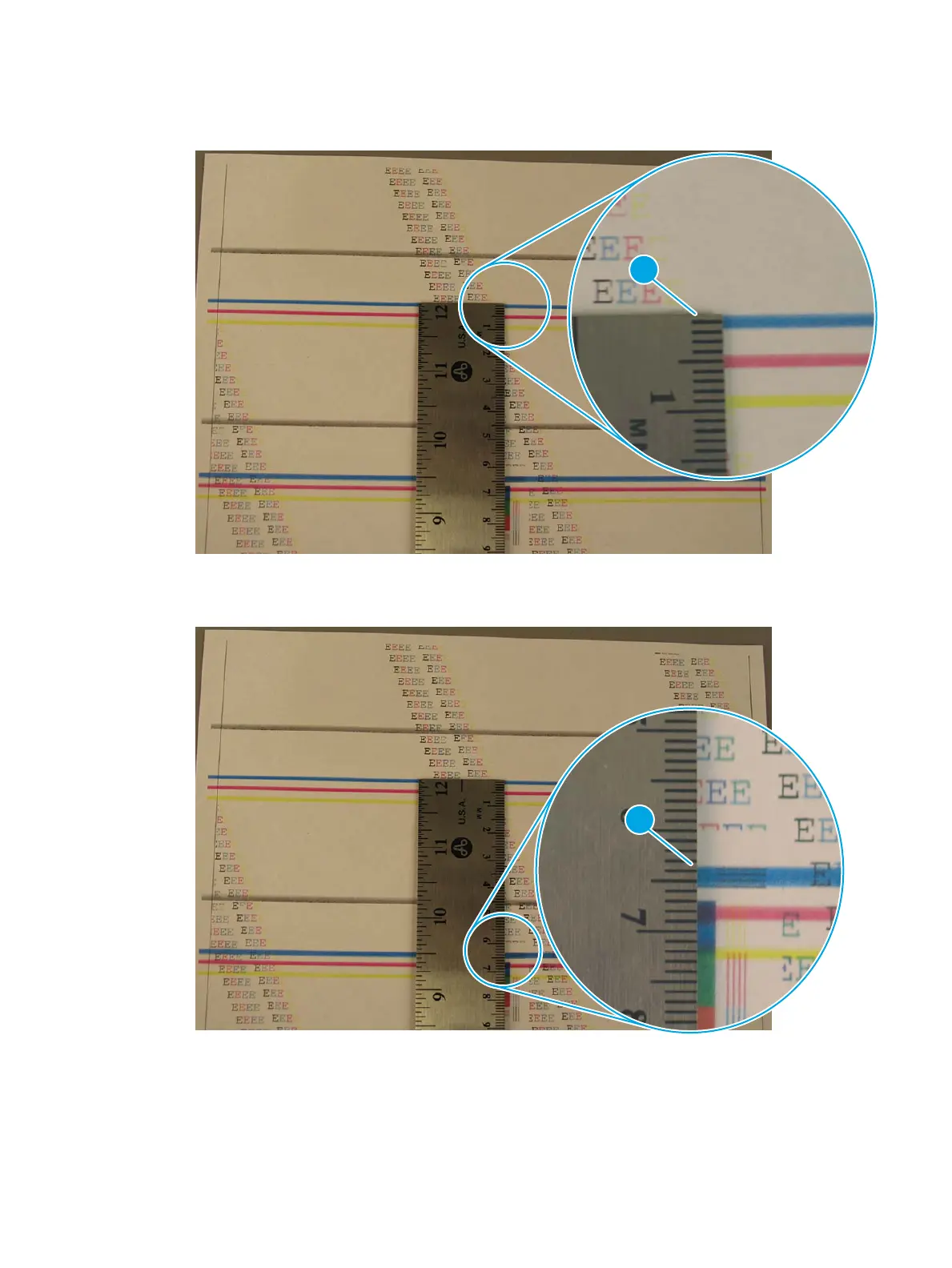 2. Position a metric ruler on the page with the “zero” ruler mark at one occurrence of the defect (callout 1).