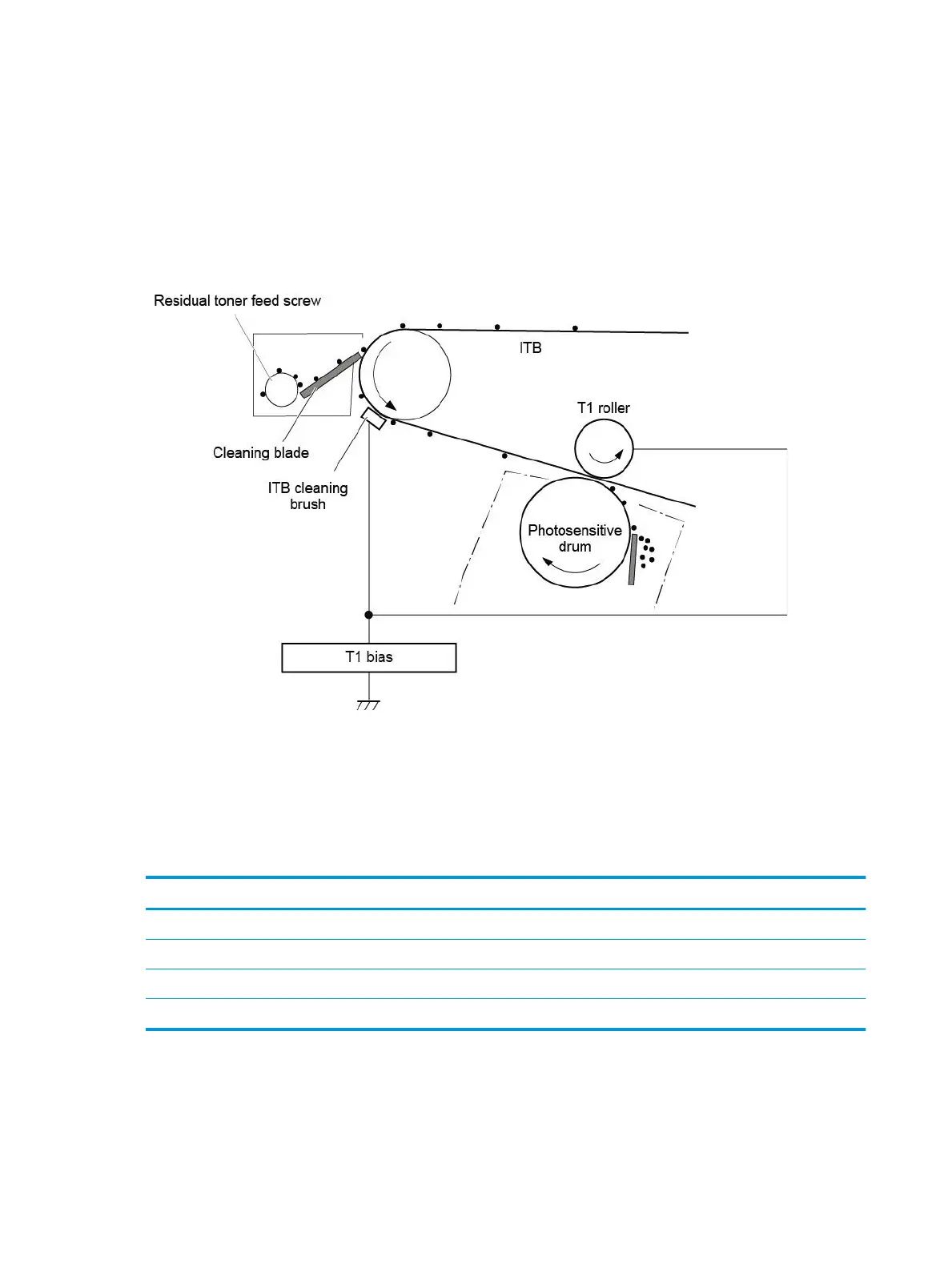 The cleaning blade in the ITB cleaner scrapes the residual toner o the ITB surface and deposits the residual