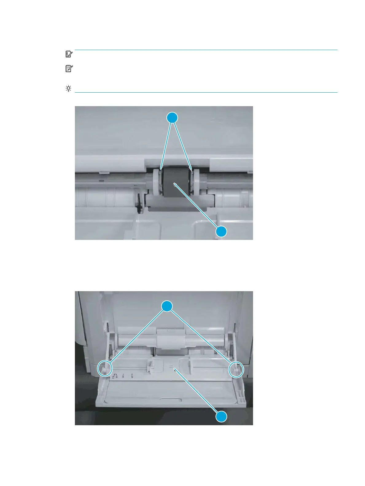 2. Release two tabs (callout 1), and then remove the roller (callout 2).