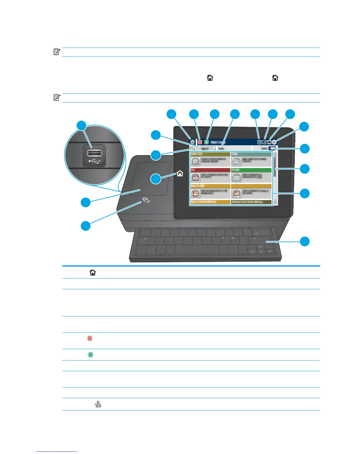 NOTE: The features that appear on the Home screen can vary, depending on the printer conguration.