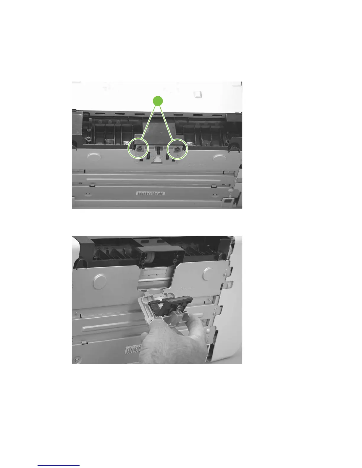 2. Support the product and tip it forward. Remove two screws (callout 1).