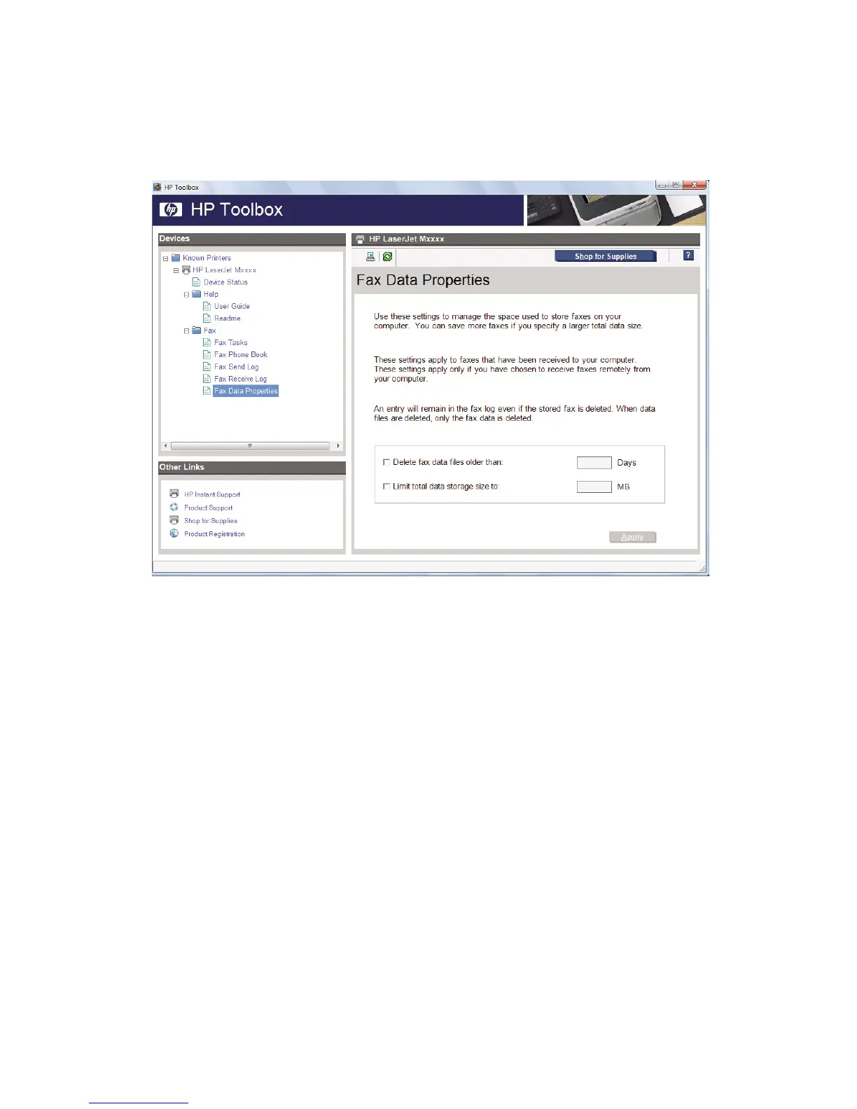 Use the HP Toolbox Fax Data Properties screen to manage the space used to store faxes on the