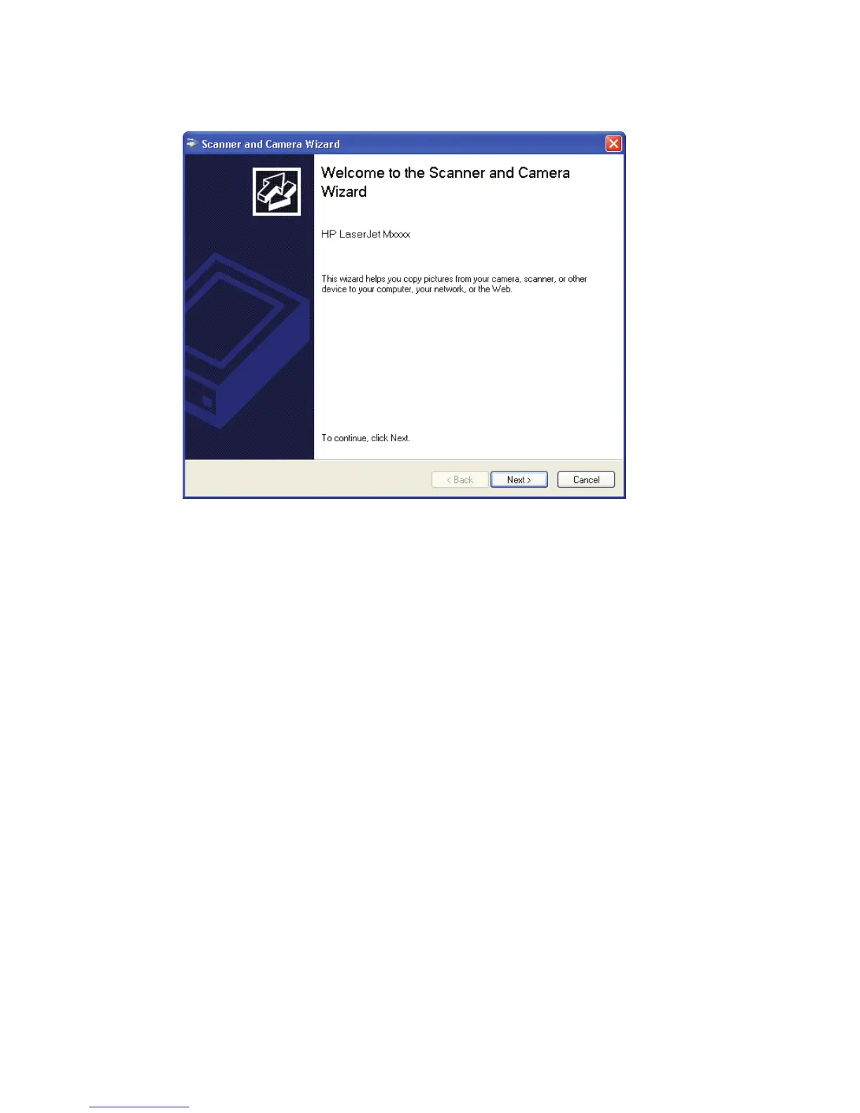 2. The Welcome to the Scanner and Camera Wizard dialog box appears.