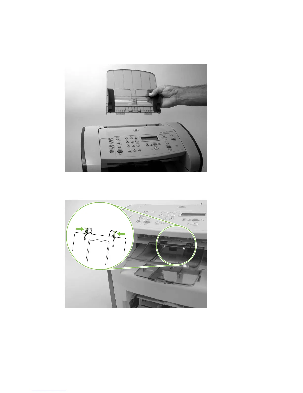 2. Rotate the ADF output bin up and then squeeze the locking tabs until the they clear the mounting