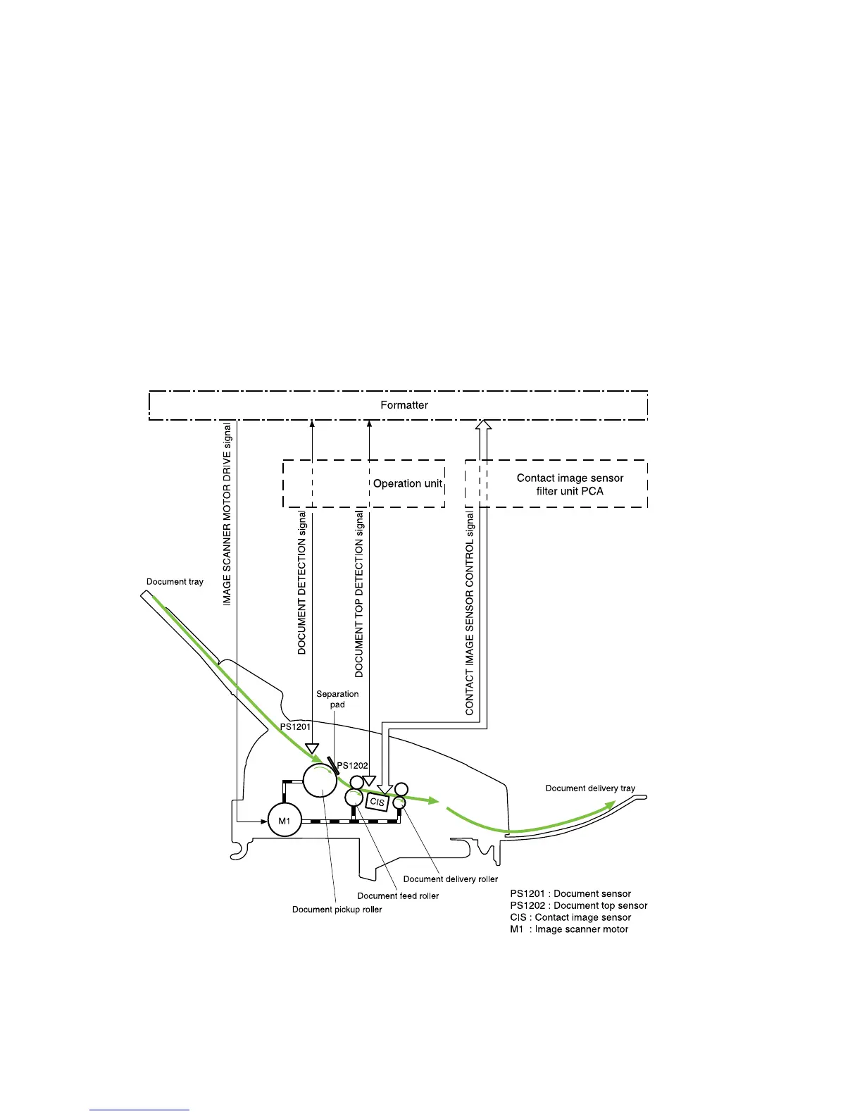 The ADF pickup-and-feed path has two sensors. The document sensor (PS1201) detects the presence