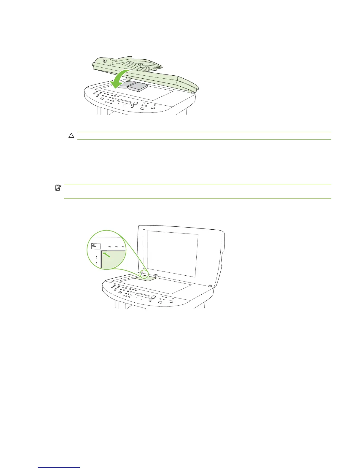 CAUTION: Pressing on the flatbed cover with too much force can break the lid hinges.