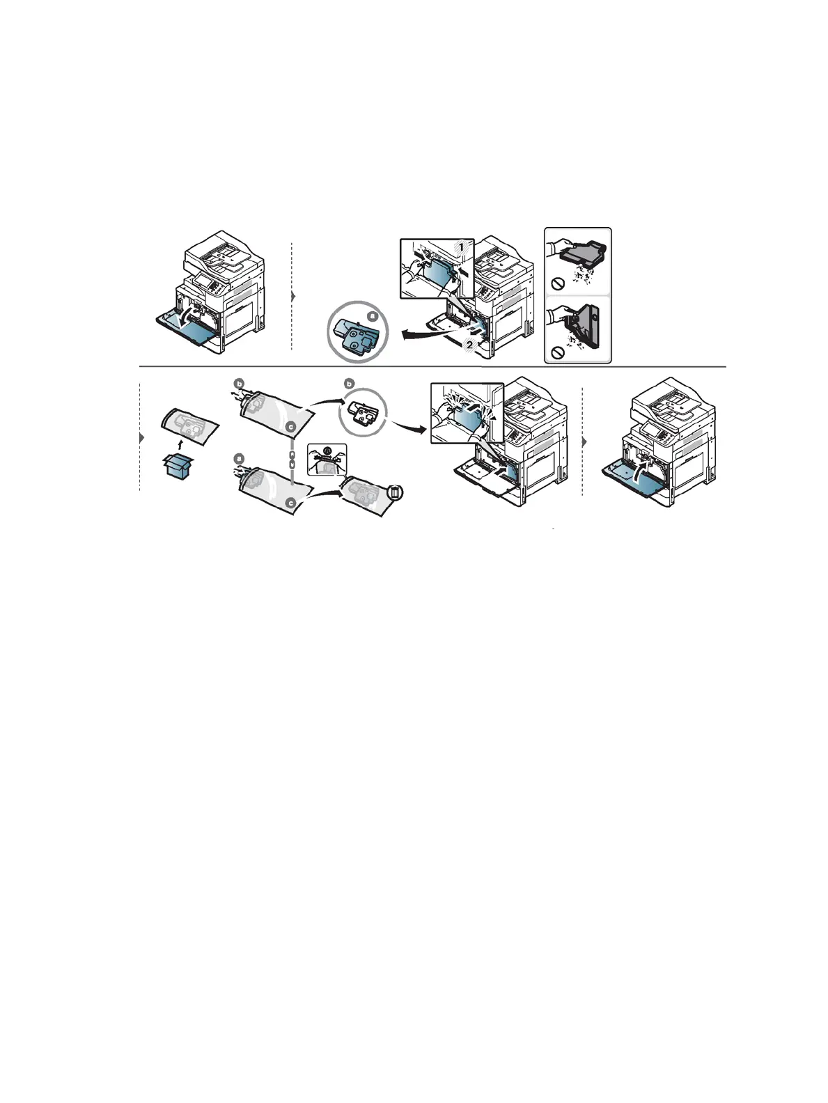 The status LED turns orange on and the display screen shows the error message of replacing toner