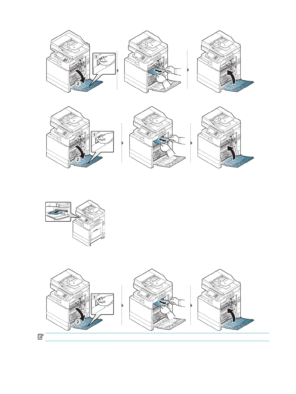 NOTE: If the optional Finisher is installed, remove the jammed paper as shown below.