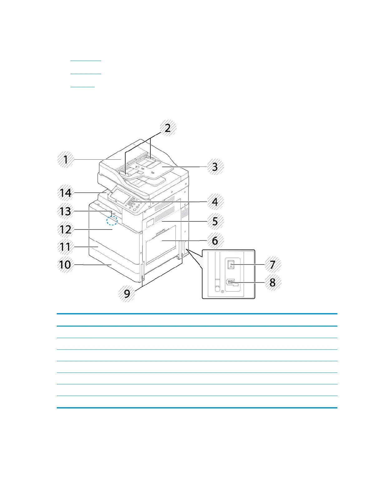 1 Document feeder cover 8 Power receptacle