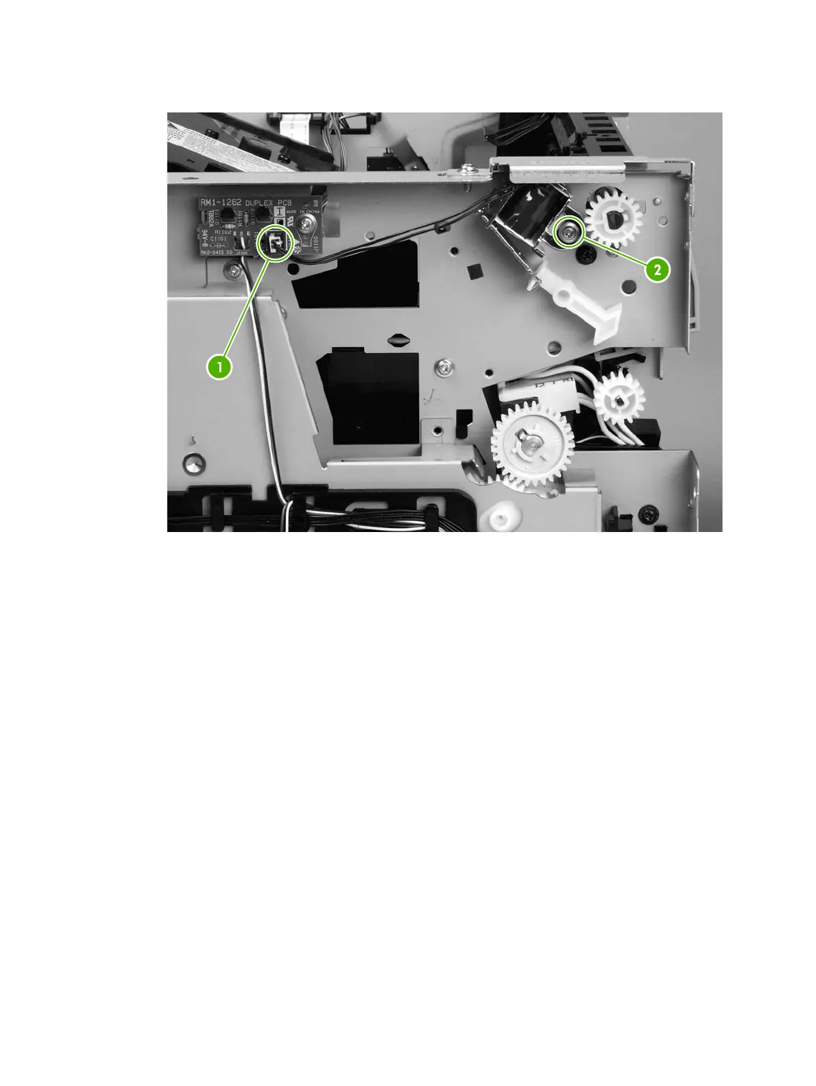 5. On the right side of the printer, press the tabs on two gears (1) to release the gears, and then