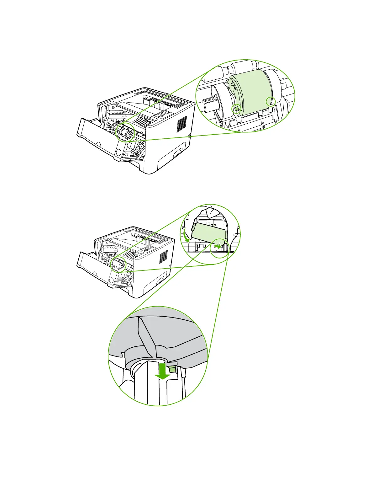 10. Line up the black retaining tabs in the printer with the grooves in the pickup roller, and then