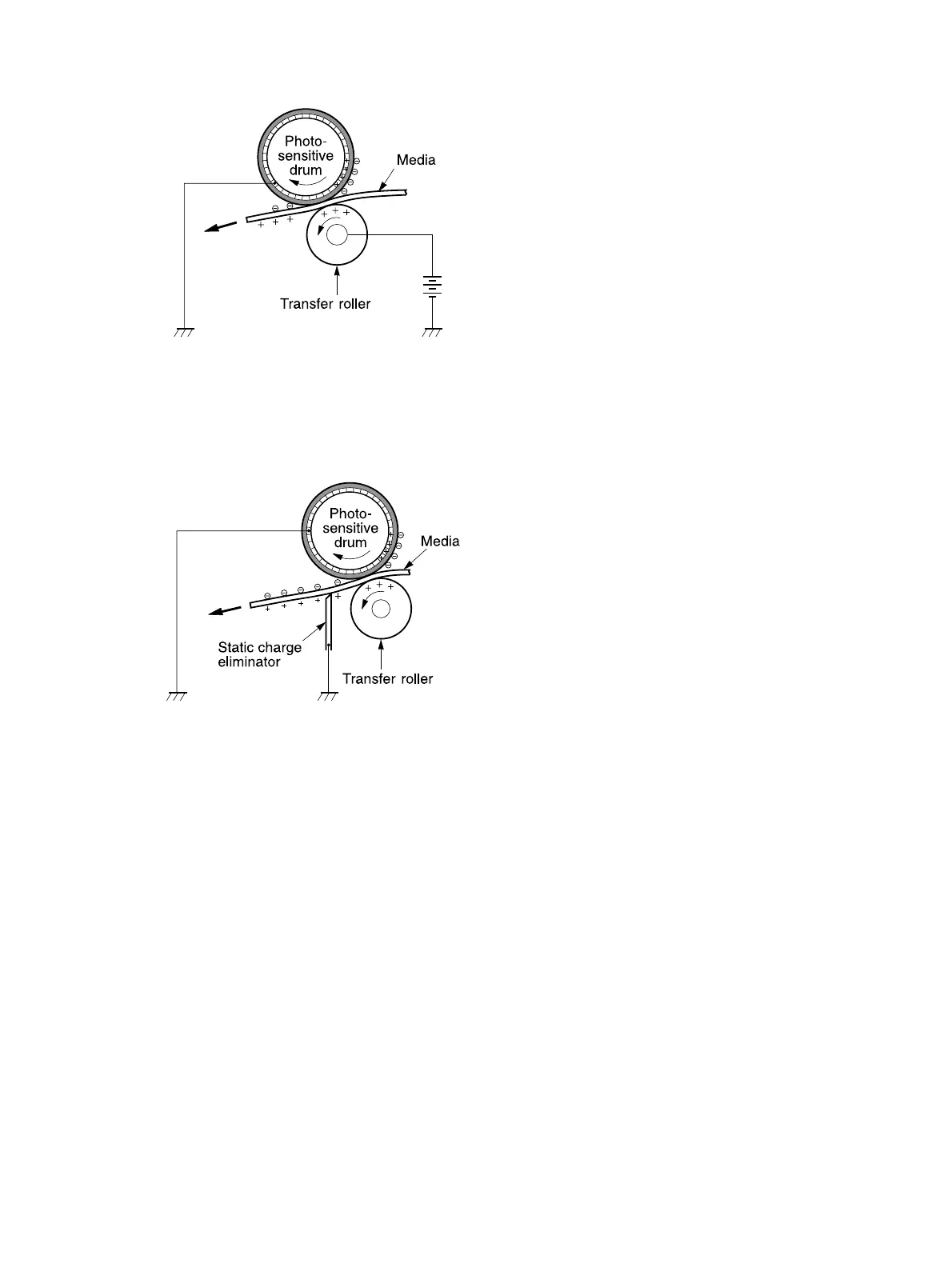 The elasticity of the print media causes its separation from the photosensitive drum. A static charge