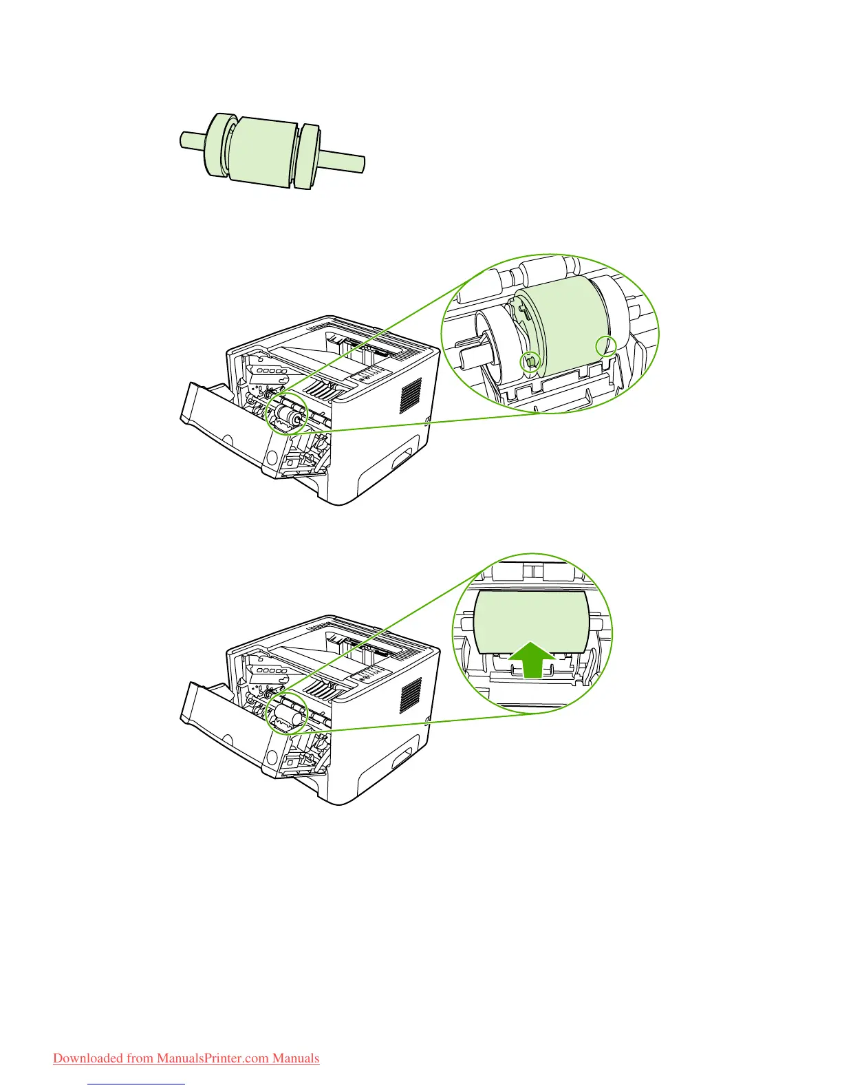 9. Line up the black retaining tabs in the printer with the grooves in the pickup roller, and then press