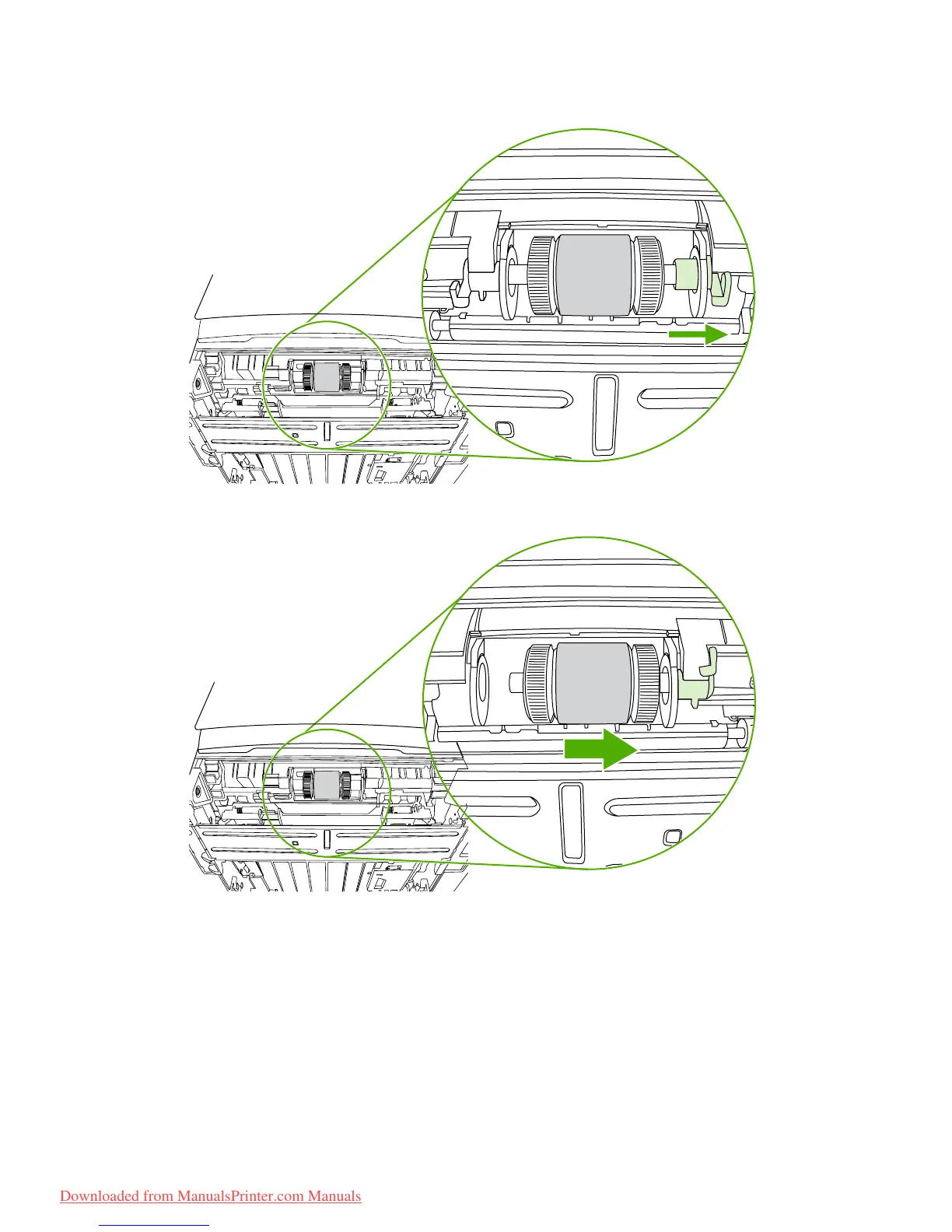 8. Slide the pickup roller assembly to the right, and remove the left end cap.
