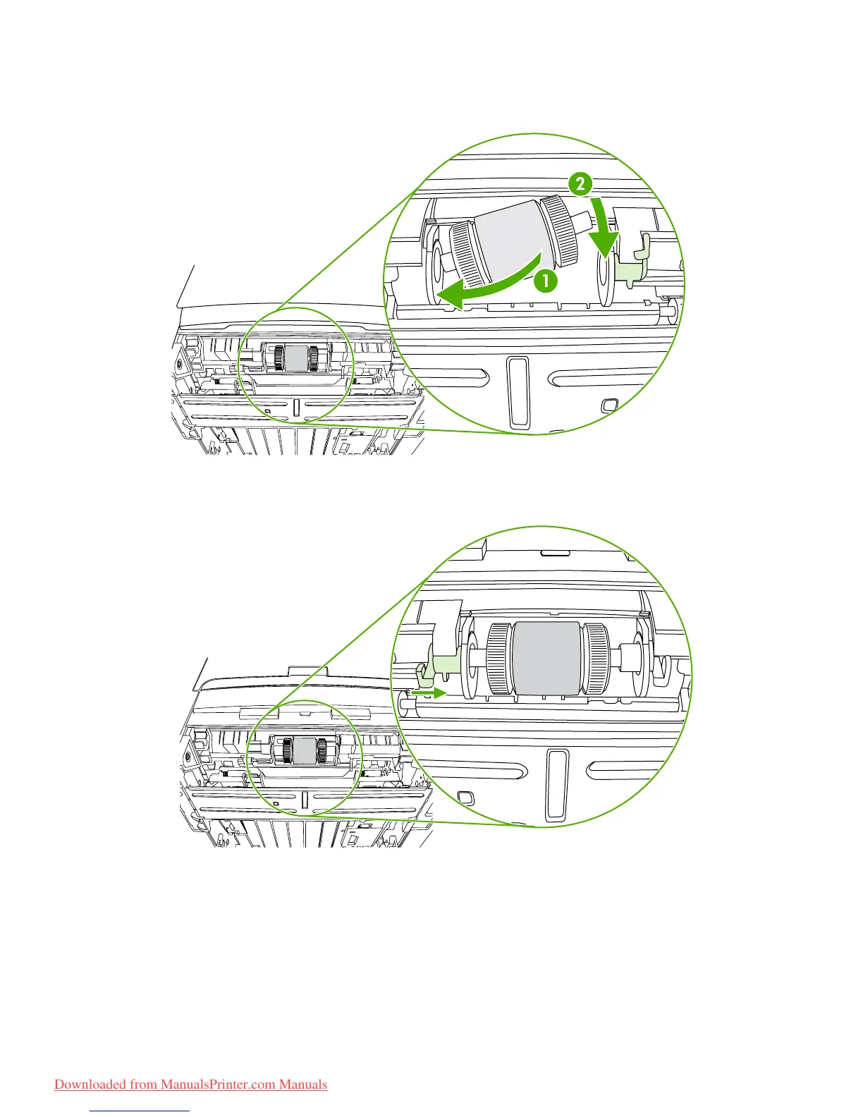13. Insert the left side of the pickup roller into the left slot (1), and insert the right side (the side that