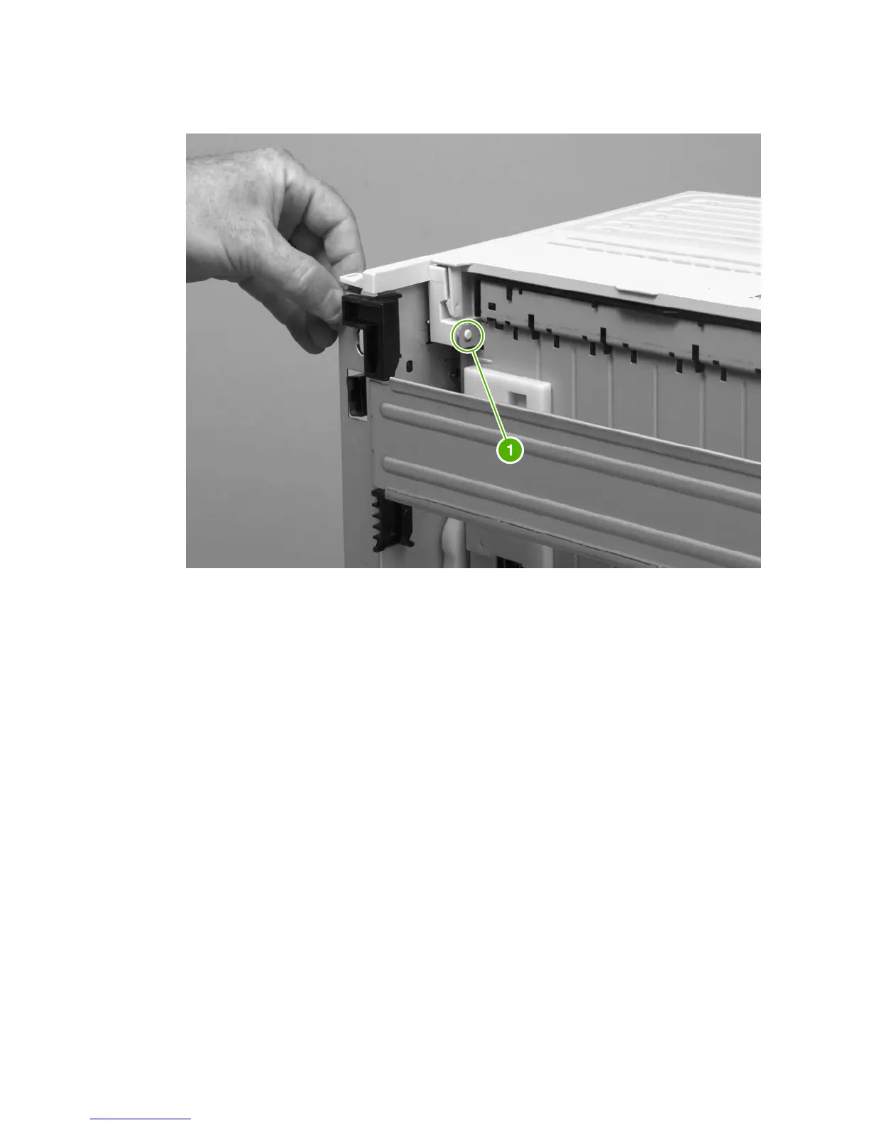 7. Slide the cover toward the right side of the printer to clear the tab (1) on the duplexer tray