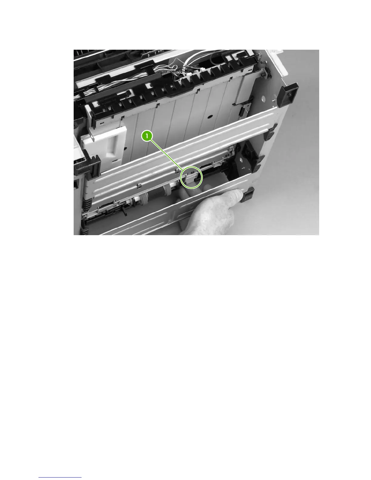 2. Pull the duplexer tray release-tab (1) to release the duplexer tray magnets.