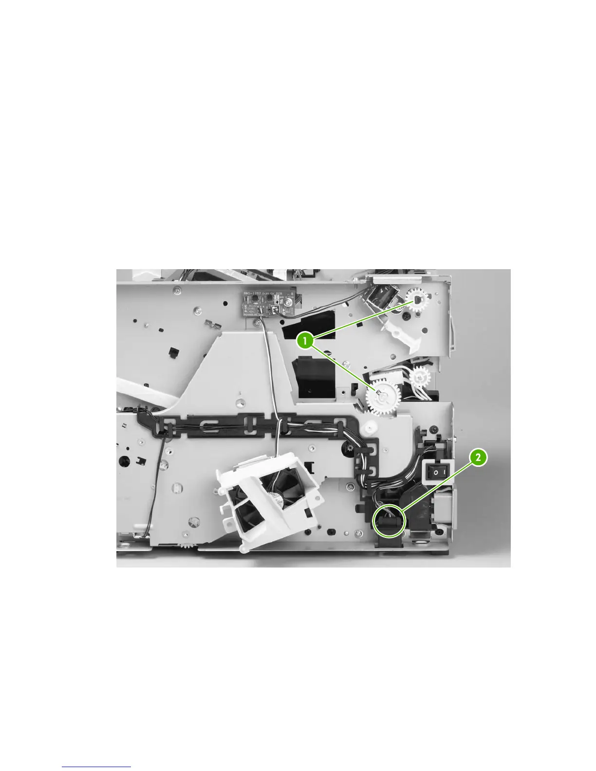 5. On the right side of the printer, press the tabs on two gears (1) to release the gears, and then