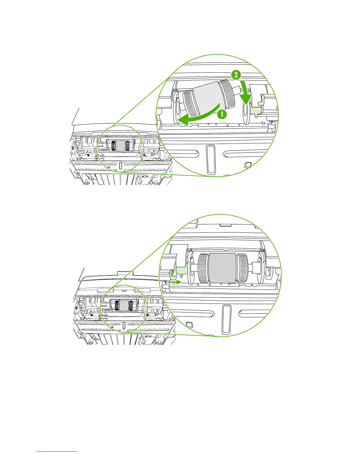 7. Insert the left side of the new pickup roller into the left slot (1), and insert the right side (the side