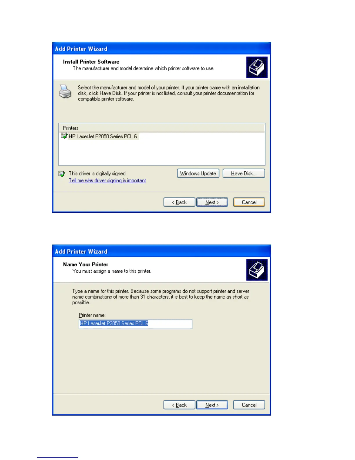 H) Please highlight the “HP LaserJet P2050 Series PCL 6” found in the