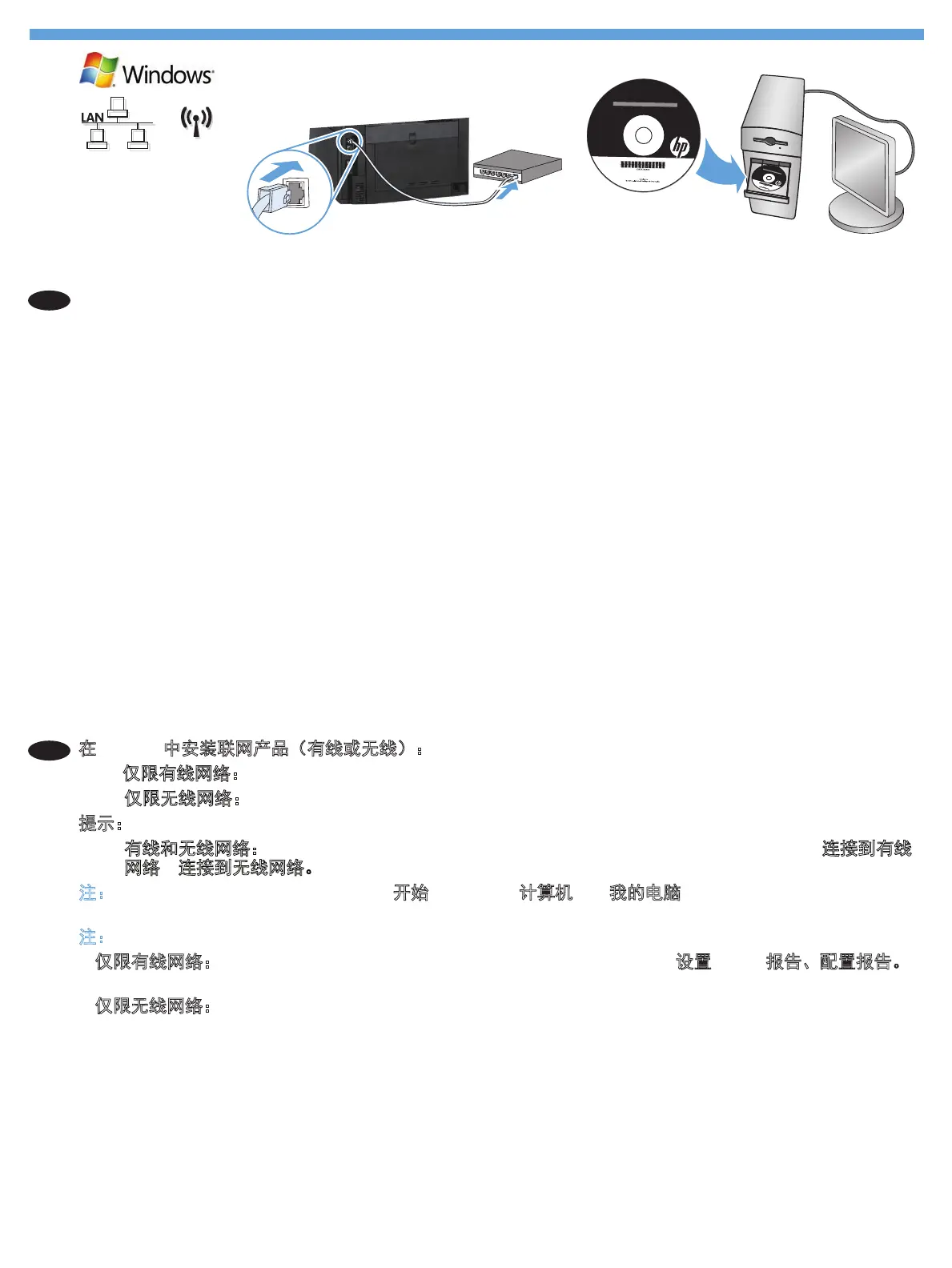 有线和无线网络:将 CD 放入计算机,然后按软件安装说明进行操作。出现提示后,选择连接到有线