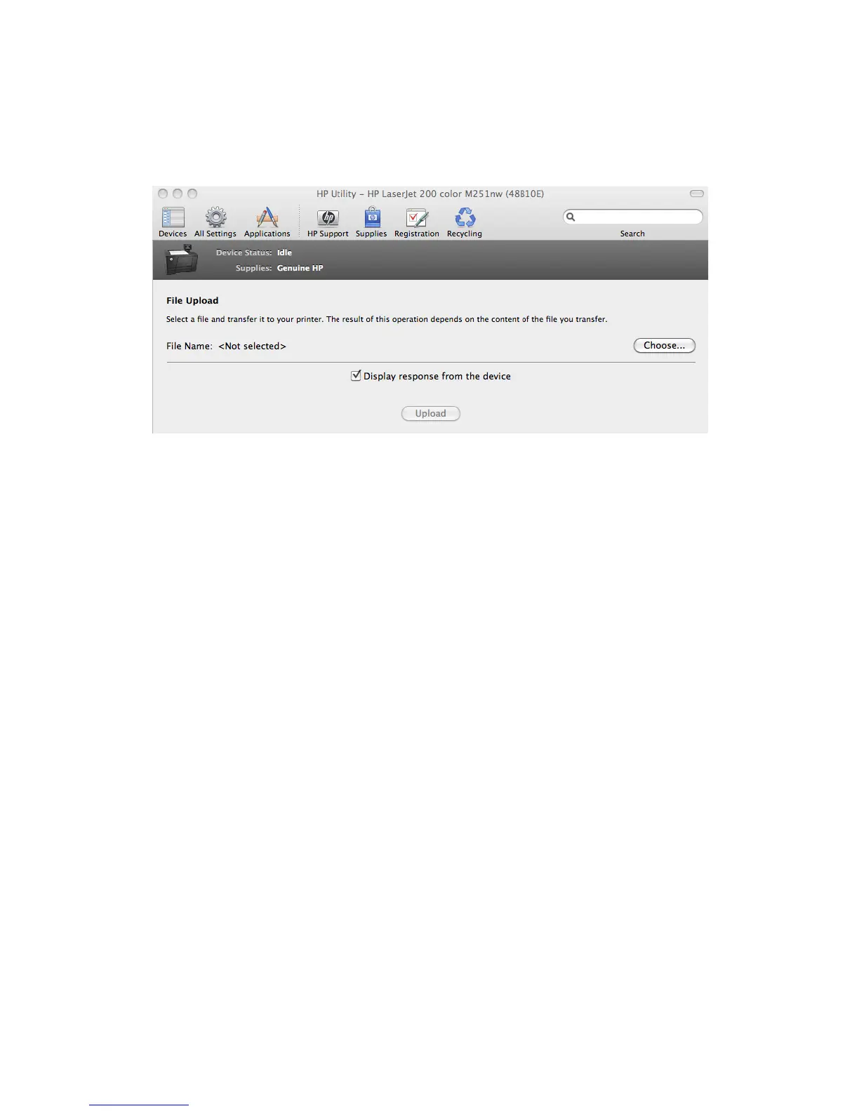 On the File Upload screen, click the Display response from the device option to verify that the