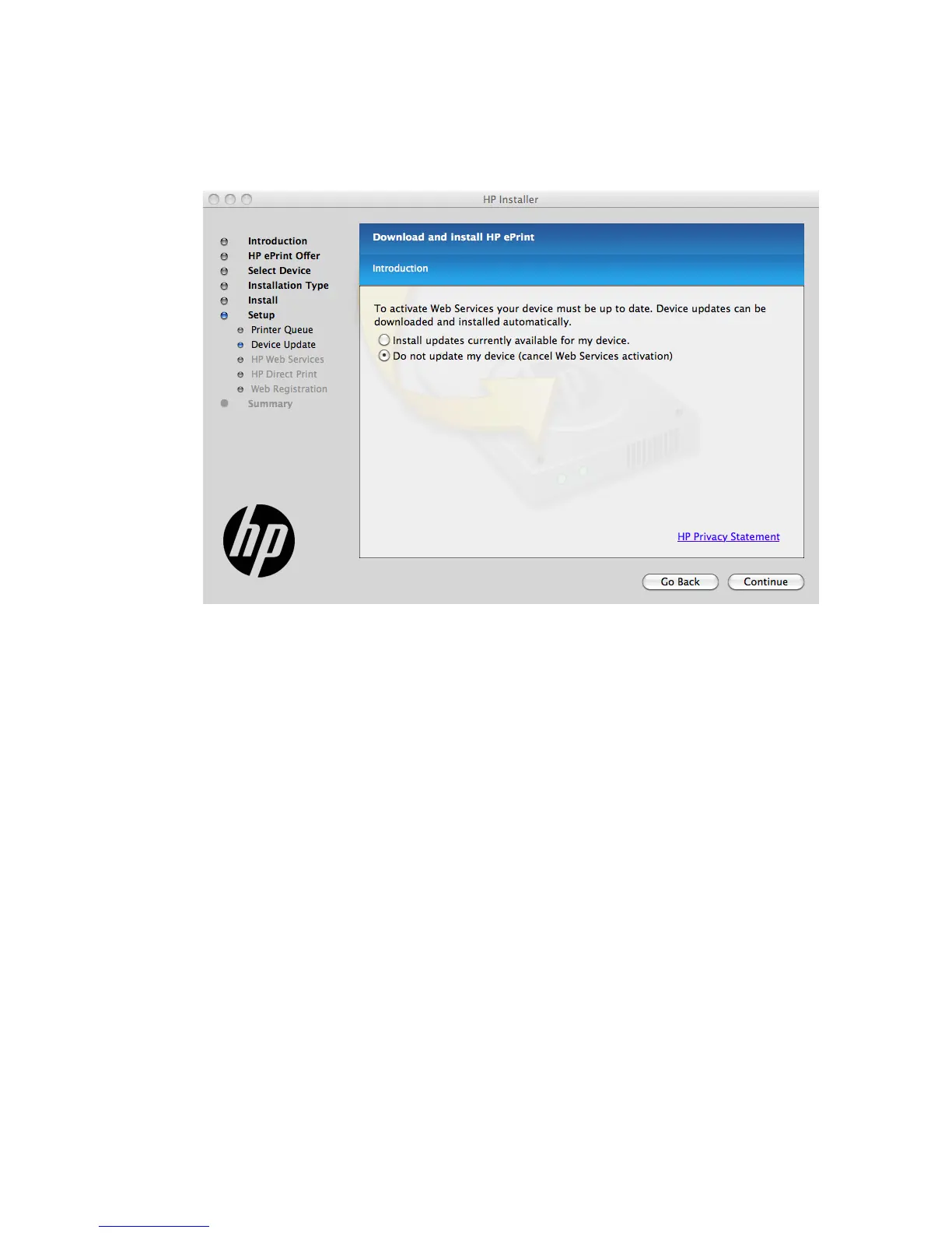available for my device, and click Continue. To cancel the HP ePrint installation, click the