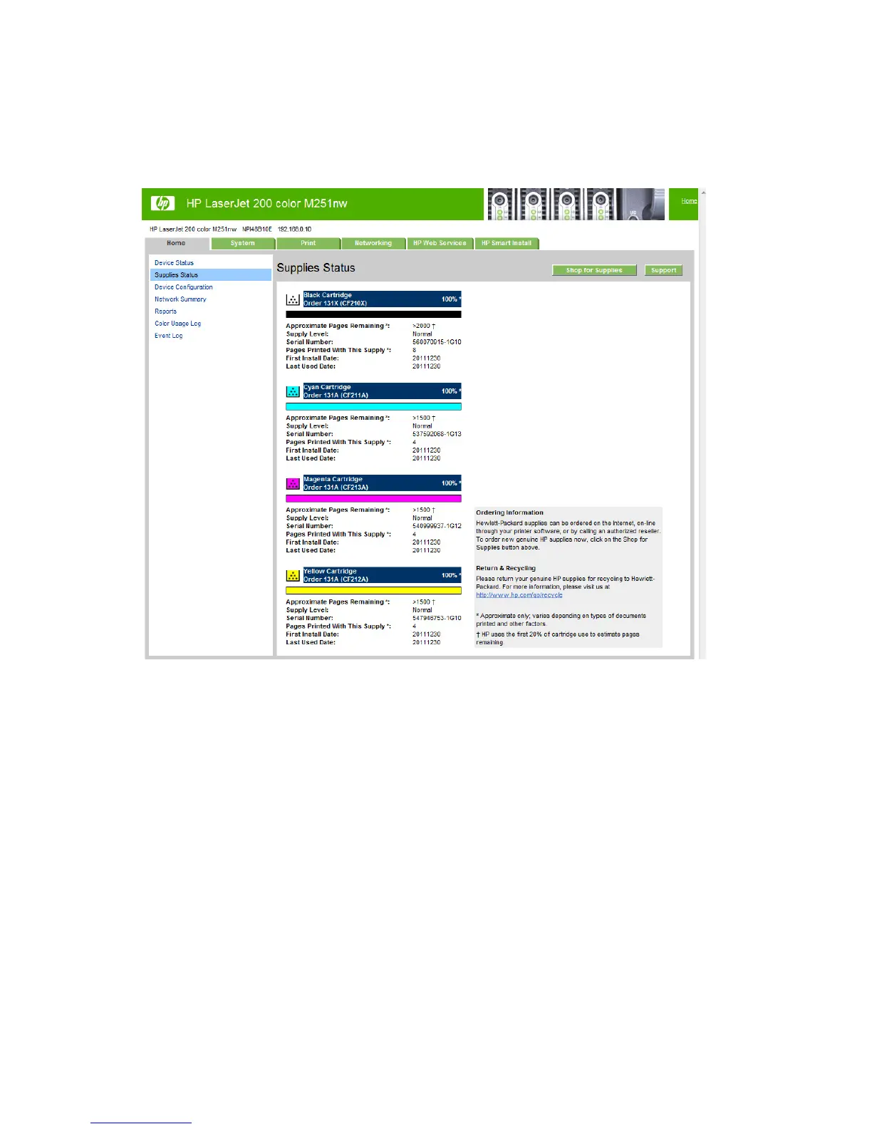 Figure 2-17 HP Device Toolbox, Home tab – Supplies Status page