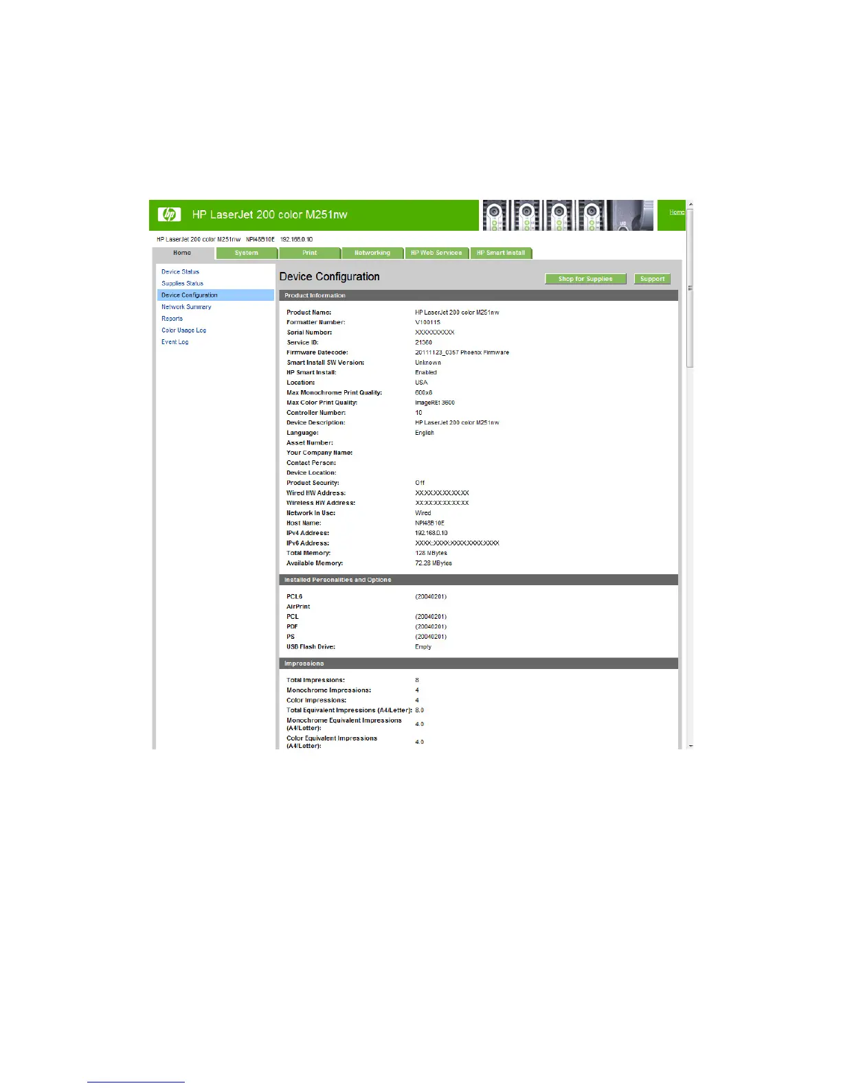 Figure 2-18 HP Device Toolbox, Home tab – Device Configuration page
