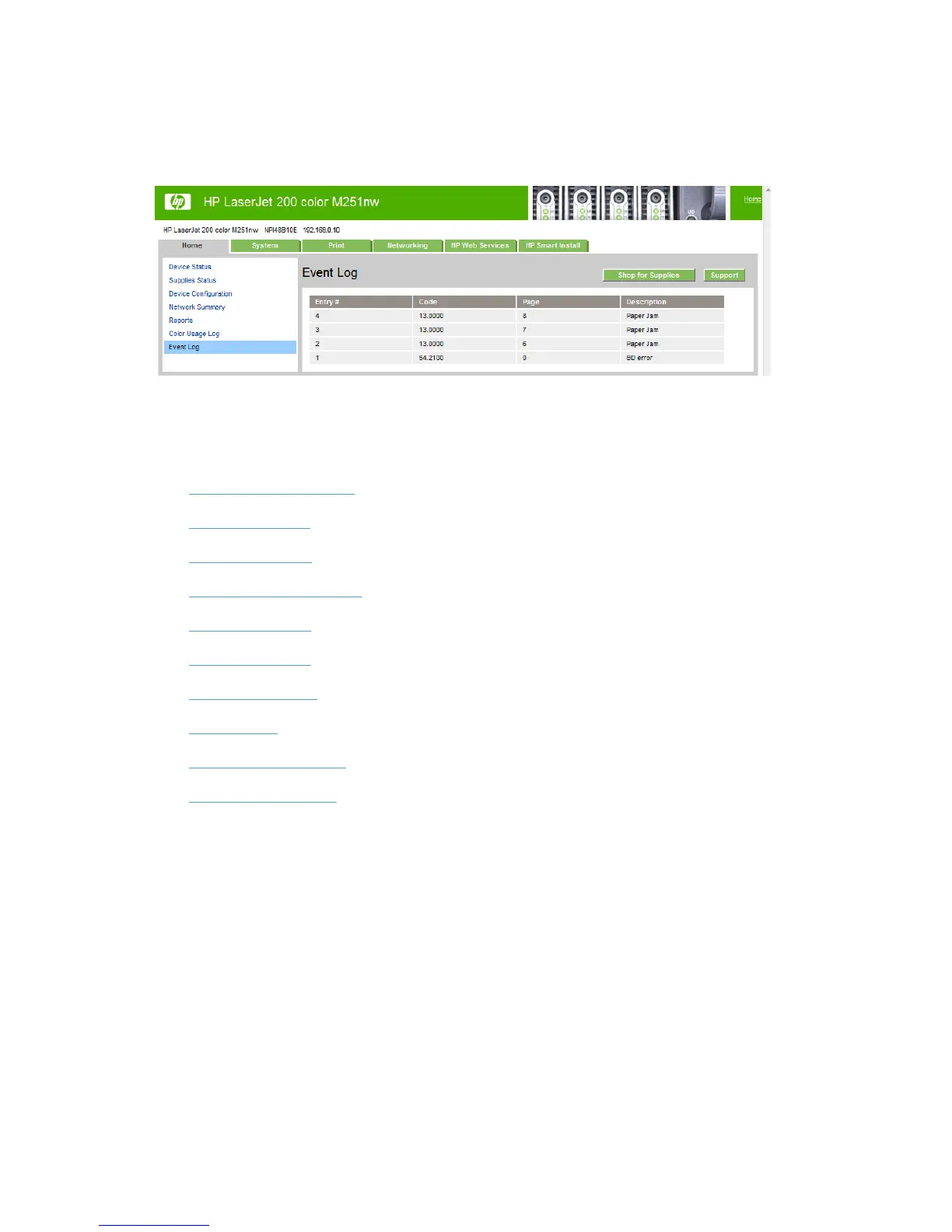 Figure 2-22 HP Device Toolbox, Home tab – Event Log page