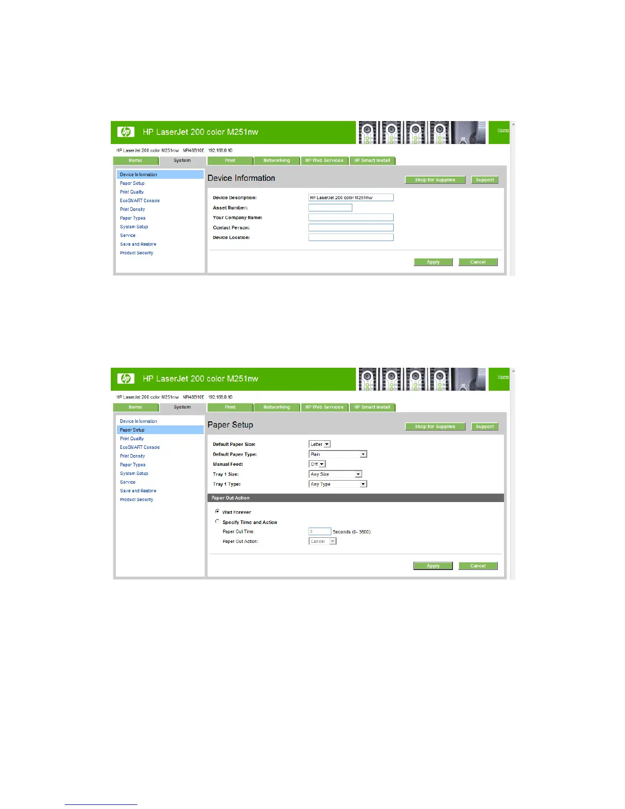 Figure 2-23 HP Device Toolbox, System tab – Device Information page
