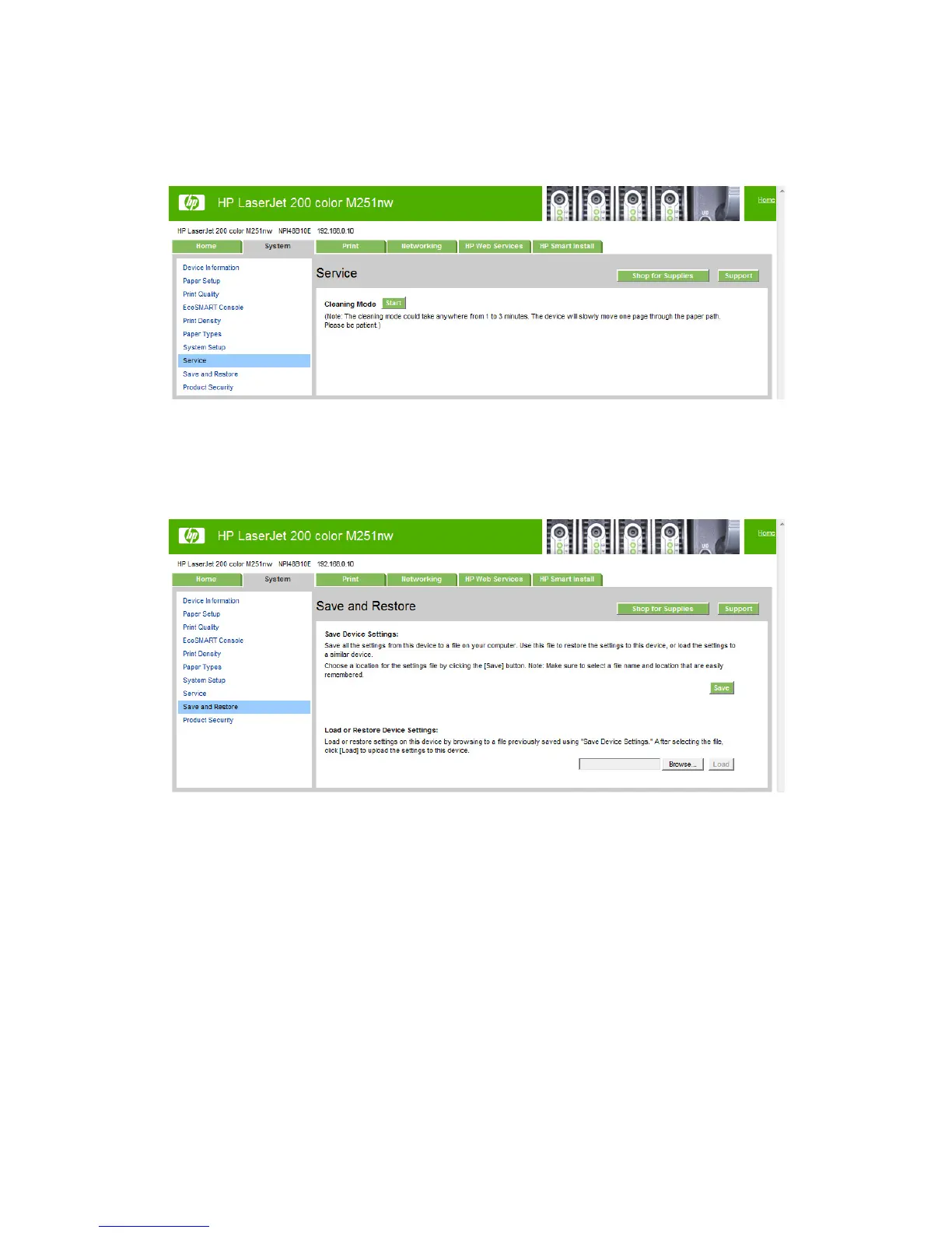 Figure 2-31 HP Device Toolbox, System tab — Save and Restore page