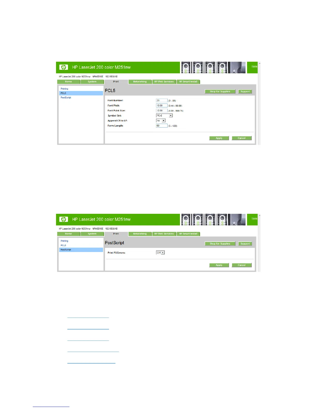 Figure 2-34 HP Device Toolbox, Print tab – PCL5 page
