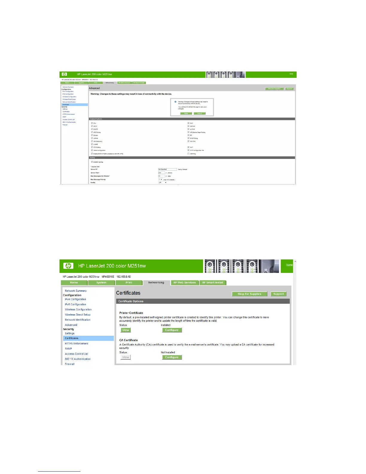 Figure 2-43 HP Device Toolbox, Networking tab — Certificates page