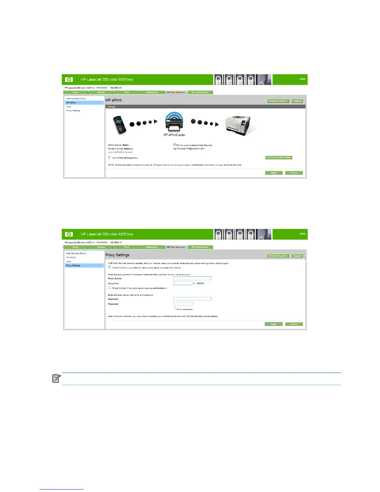 Use the Proxy Settings page to set the HP Web Services proxy server.