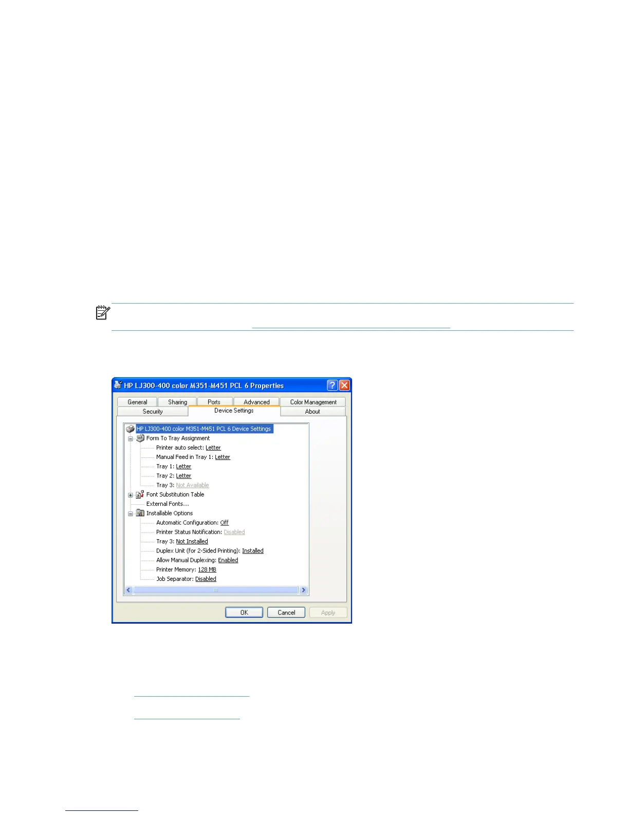 NOTE: The Device Settings tab is located on the Printer Properties tab set. For information about