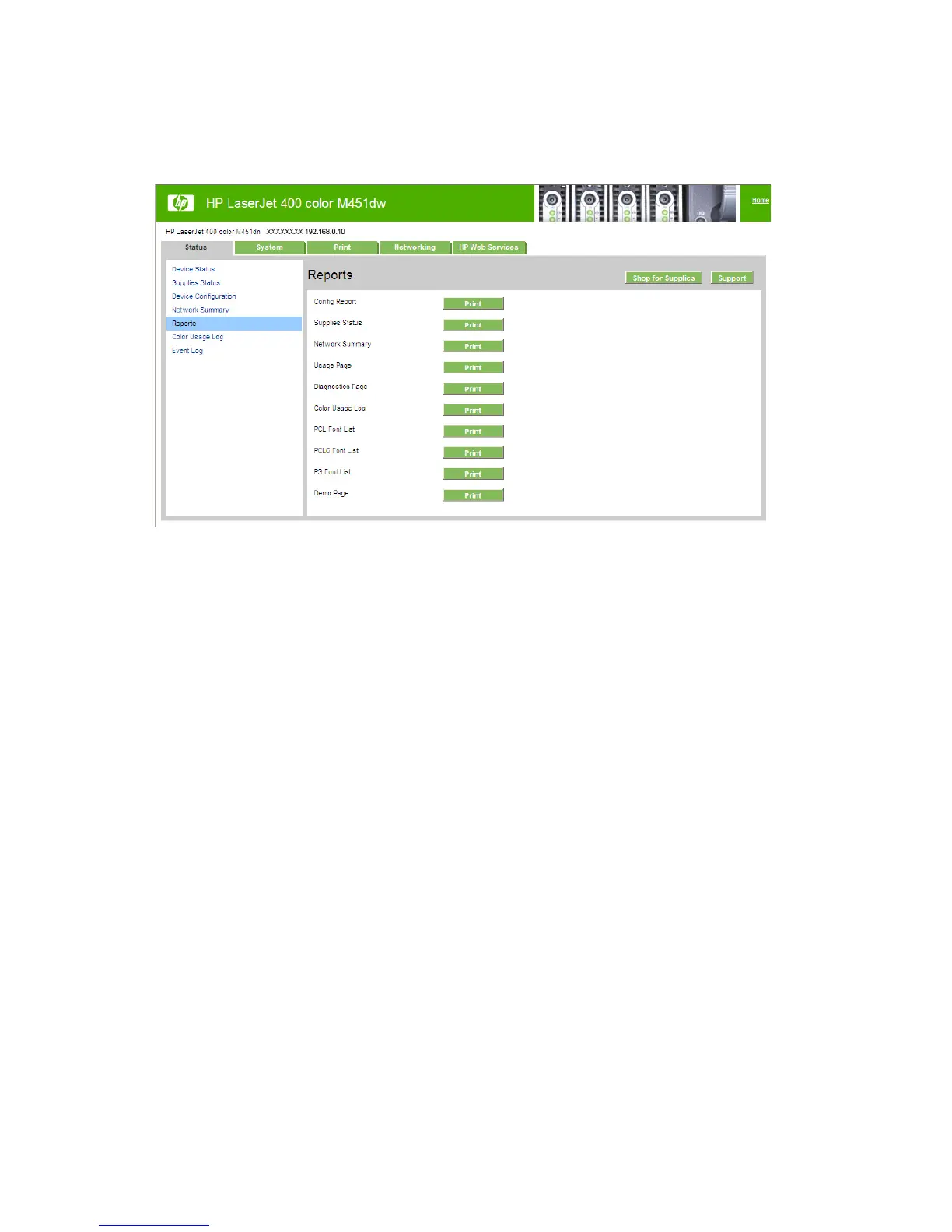 HP LaserJet Pro 400 M451 series - Figure 2-20 HP Device Toolbox, Status Tab - Reports Page