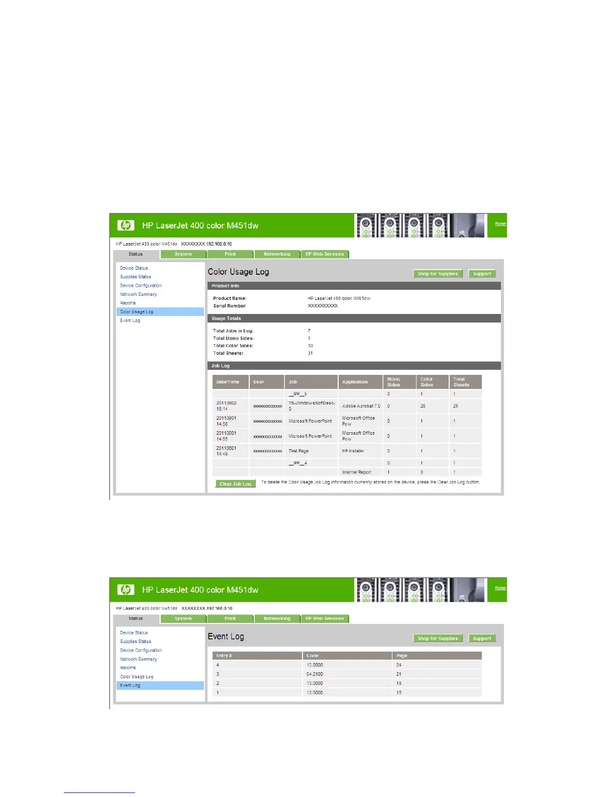 Figure 2-22 HP Device Toolbox, Status tab – Event Log page