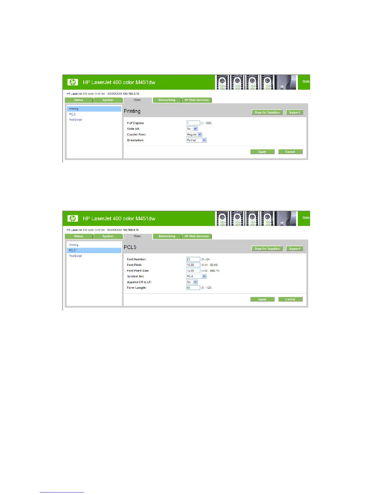 Use the PCL5 page to change the PCL defaults for the product.