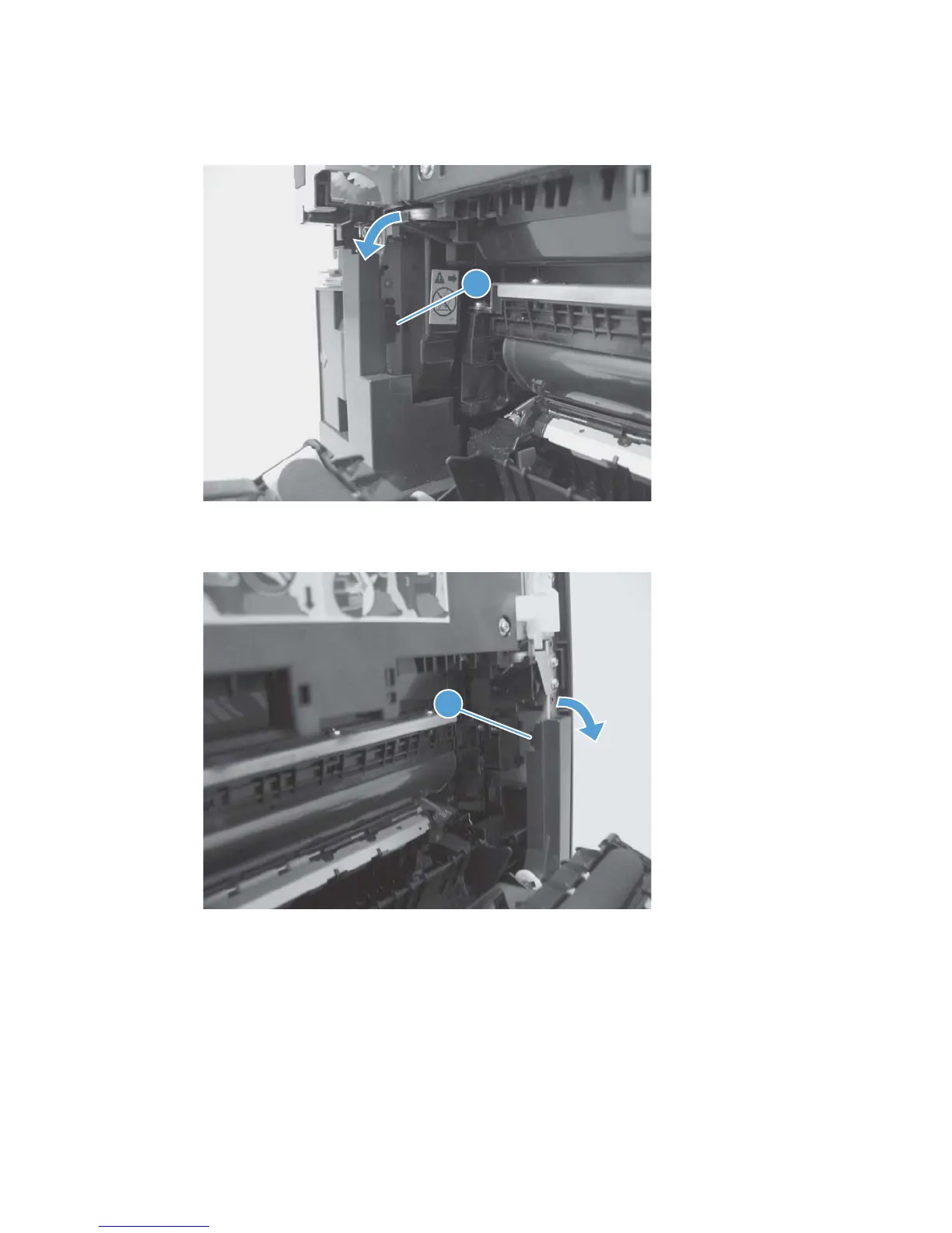 2. Open the duplex-feed assembly, release one tab (callout 1), and then slightly separate the cover from