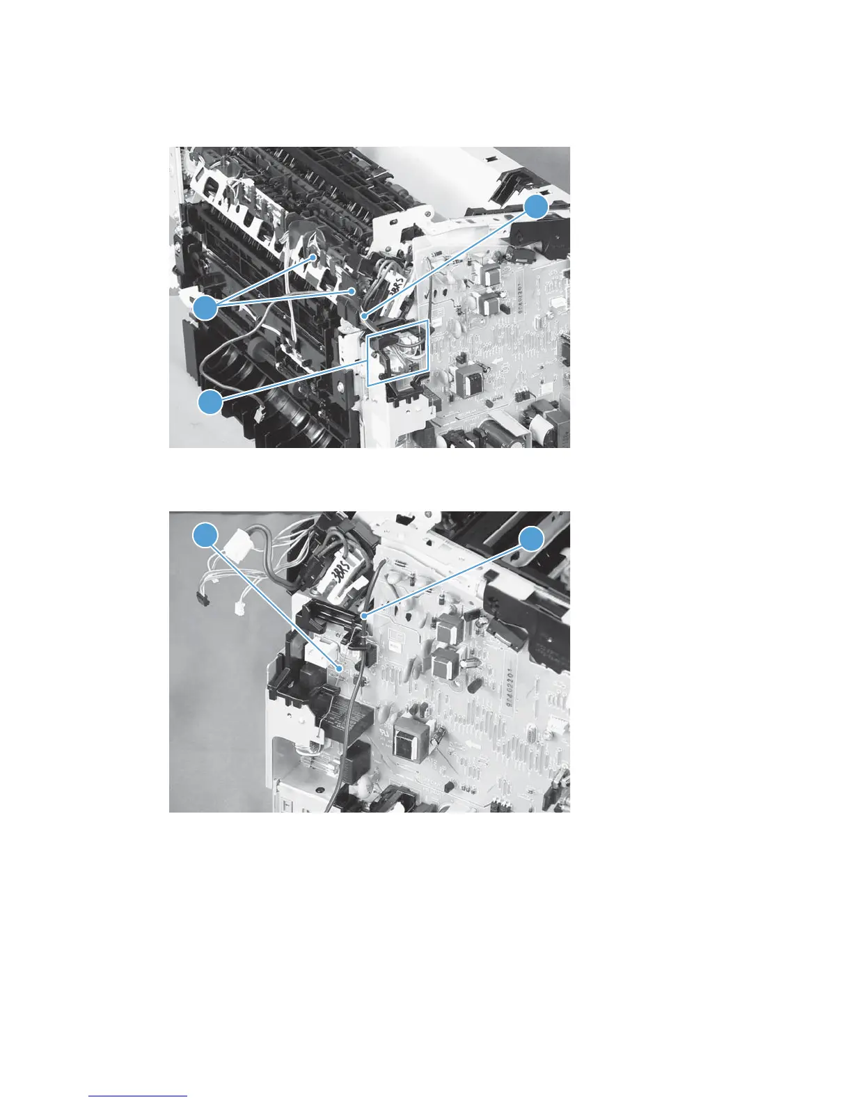 4. Disconnect four connectors (callout 1), and then release the wire harnesses (callout 2) from the