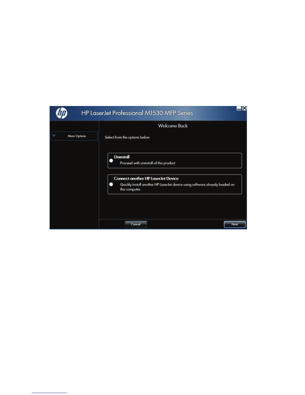 ● Connect another HP LaserJet Device. Click this option to quickly install another HP product