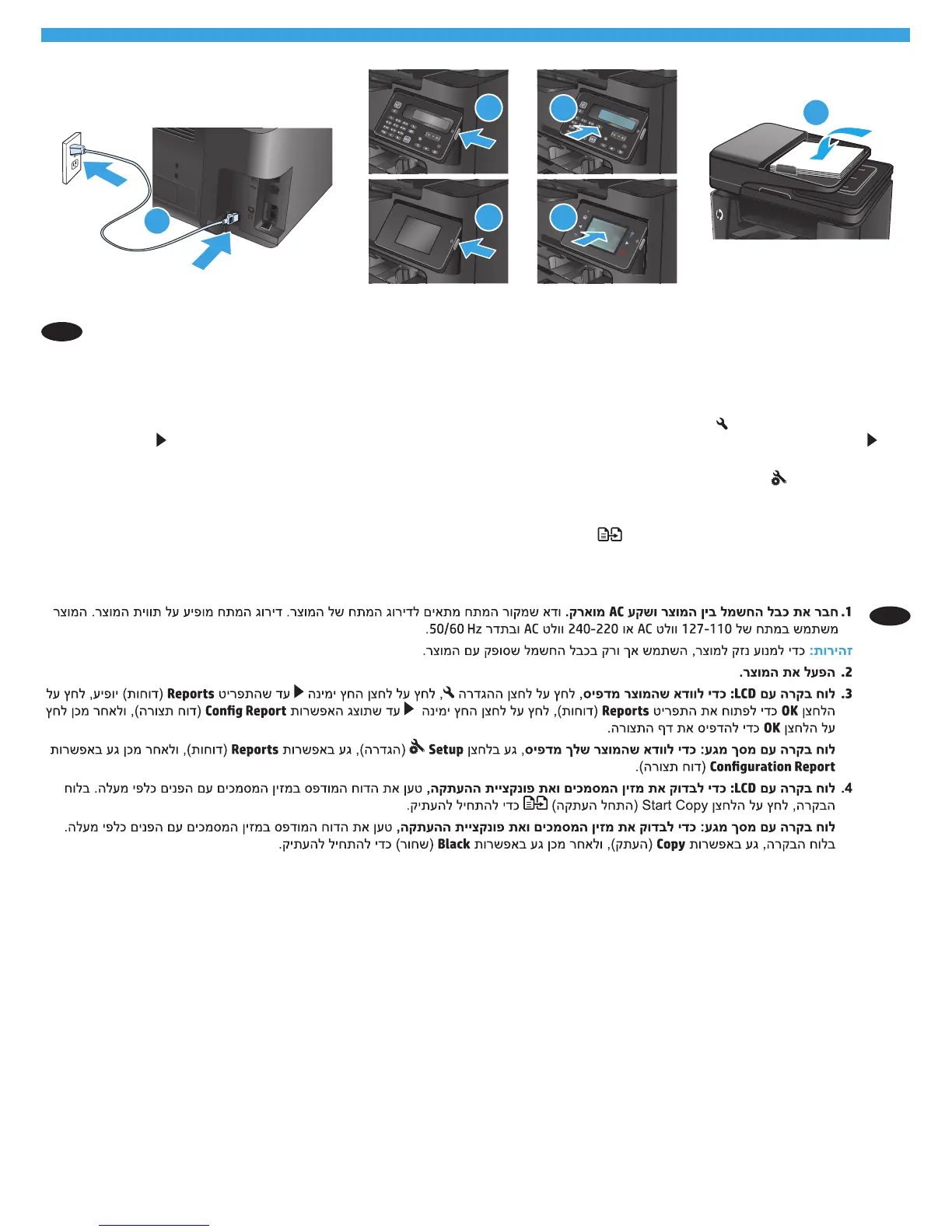 4. Painel de controle de LCD: Para testar o alimentador de documentos e a função de cópia, coloque o relatório impresso voltado para cima