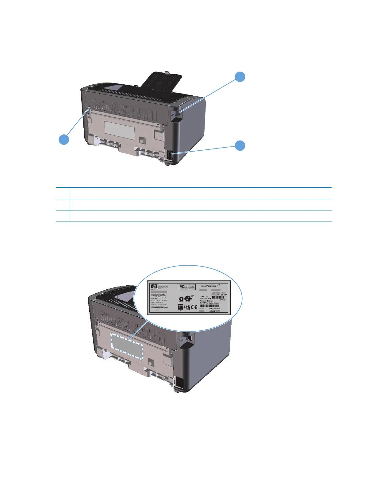 HP LASERJET Professional P1100 series - Back view; Serial number and product number location